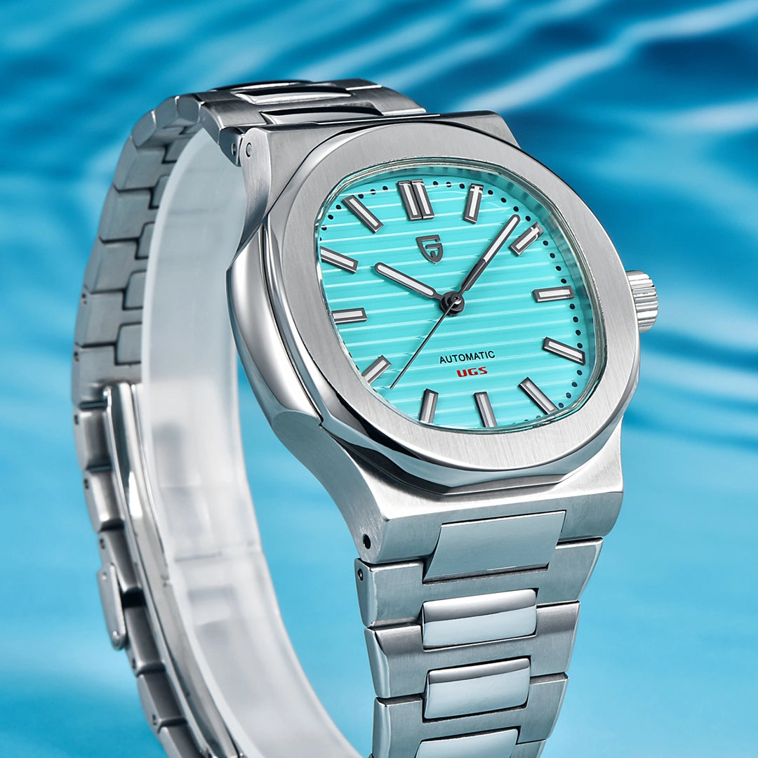 Skiller du deg gjerne ut med stil? Pagani Design PD-1639 med tiffany-blå skive gir deg en moderne fargetone uten å gå på kompromiss med klassisk urdesign. Denne modellen kombinerer et pålitelig automatisk urverk, robust konstruksjon og en iøynefallende farge som vekker oppmerksomhet – på kontoret, på reise eller på middag.